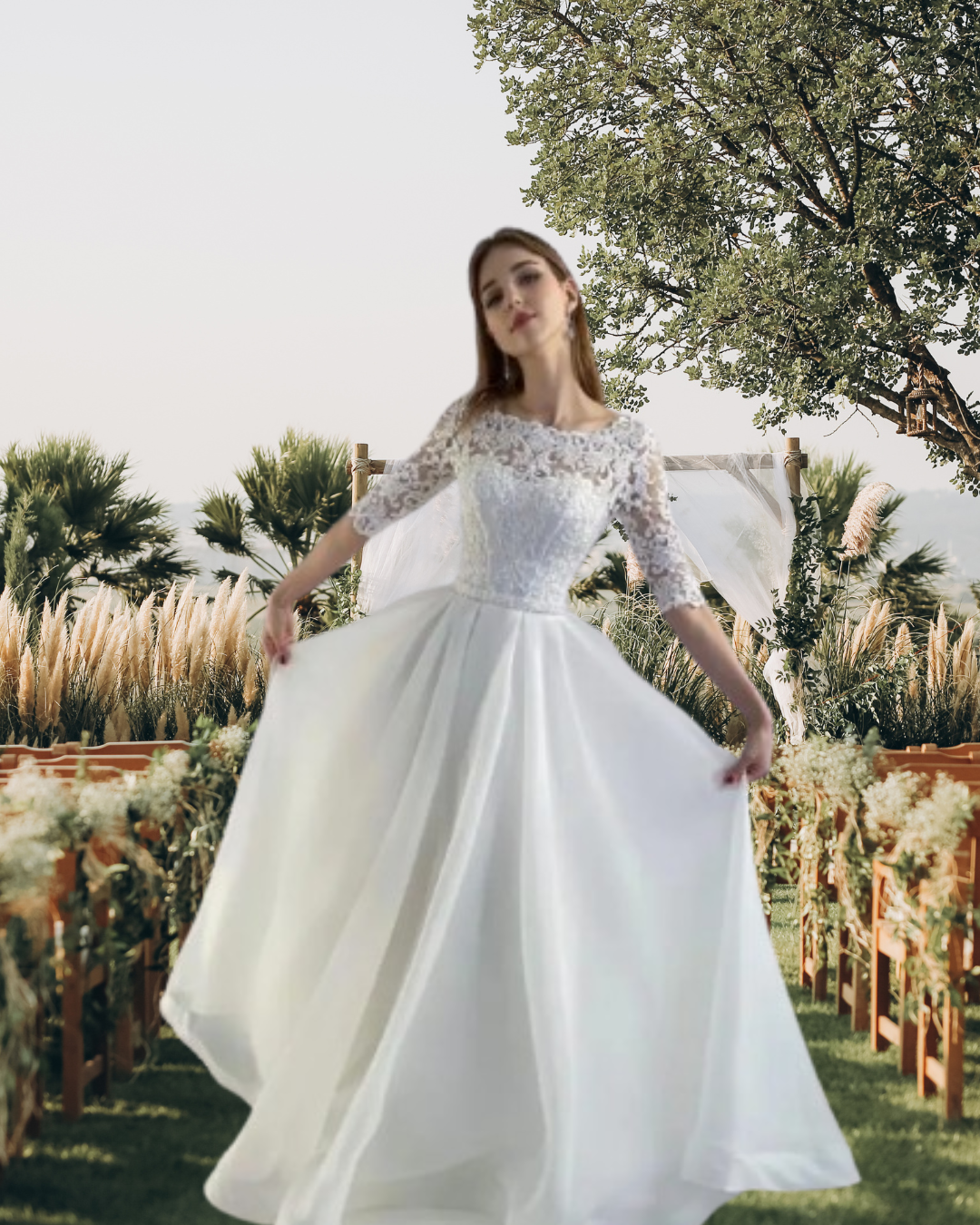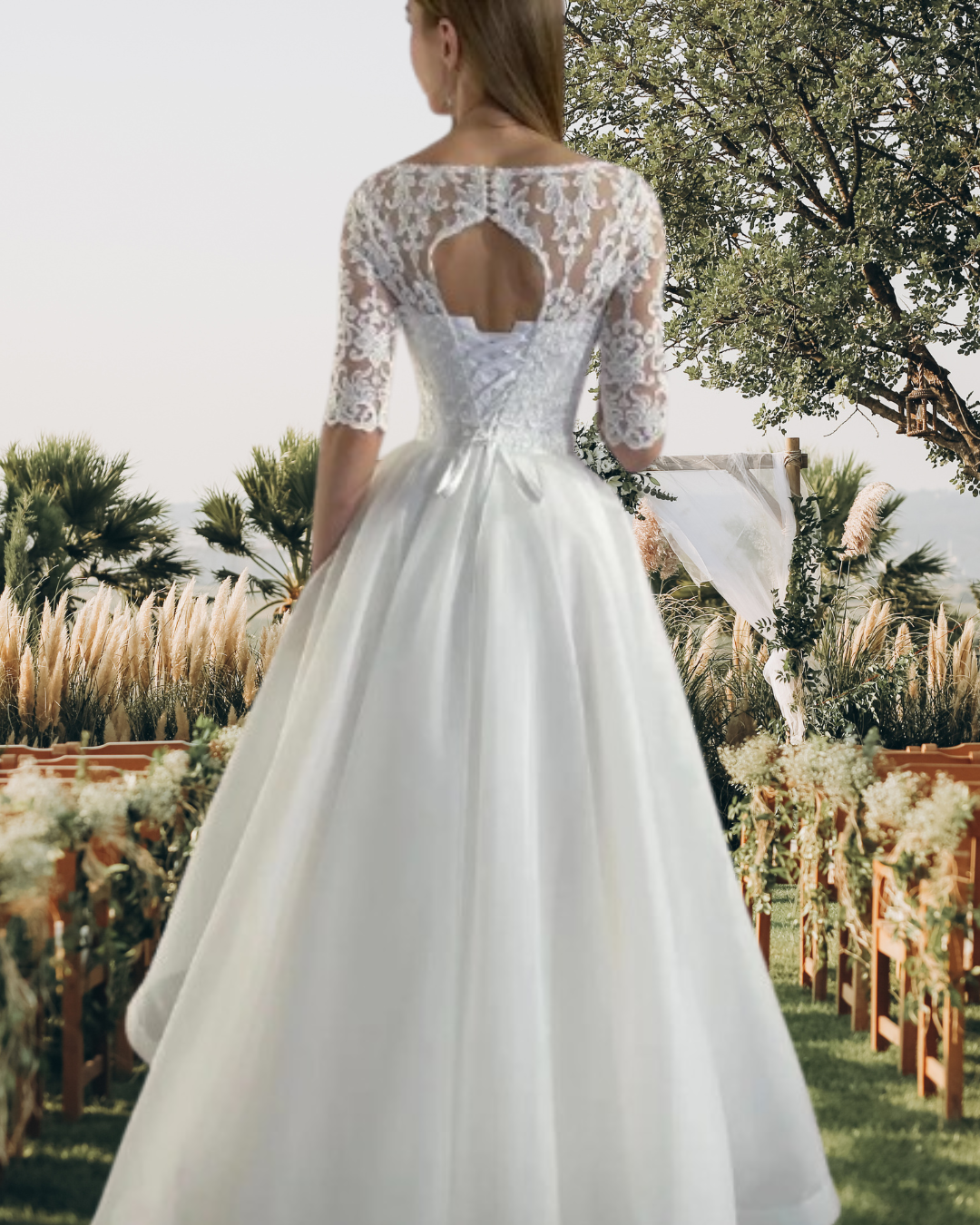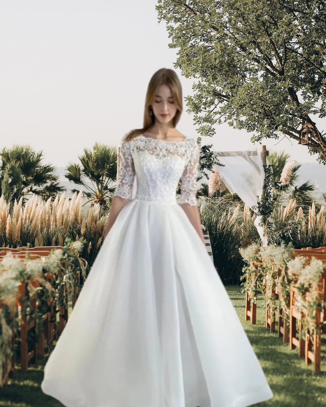 This vintage-inspired country lace wedding dress features delicate appliques and a flattering scoop neckline. Designed with half sleeves and an A-line silhouette, it offers timeless elegance and comfort for your special day. Customizable to your exact measurements, this bridal gown ensures a perfect fit, embodying the grace and charm of a princess bride. Ideal for brides seeking classic style with a personalized touch.